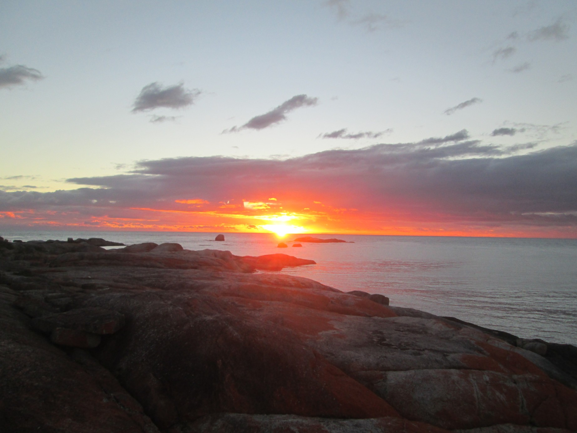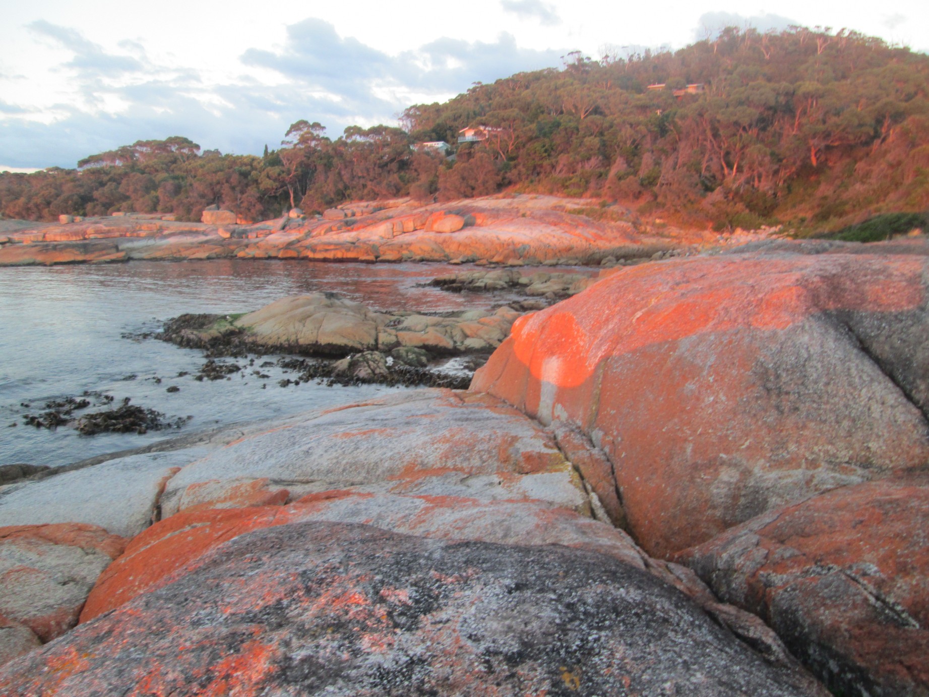 The morning sun lights up the lichen on the rocks at Bicheno (74/80)